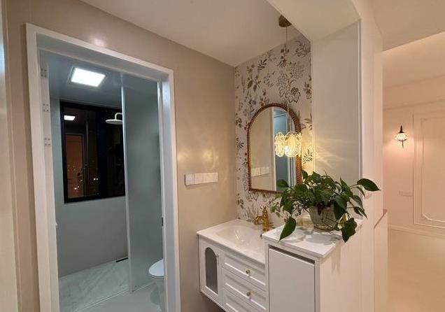 这是主卧卫生间,考虑到需求,没有做干湿分离,利用墙上的位置,设计了壁龛,可以增加一些收纳空间,太合适了。包括安装得镜子,自带LED灯,太温馨了。