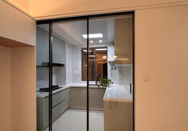 厨房根据结构定制了橱柜,刚好把空间利用起来,并且布局是比较合理的,让人到时候入住了,在这样的厨房做饭菜,都很有心情哈。而且透明玻璃移动门,更有通透感。橱柜虽然不是白色的,但是这种颜色也是比较好看的哈。