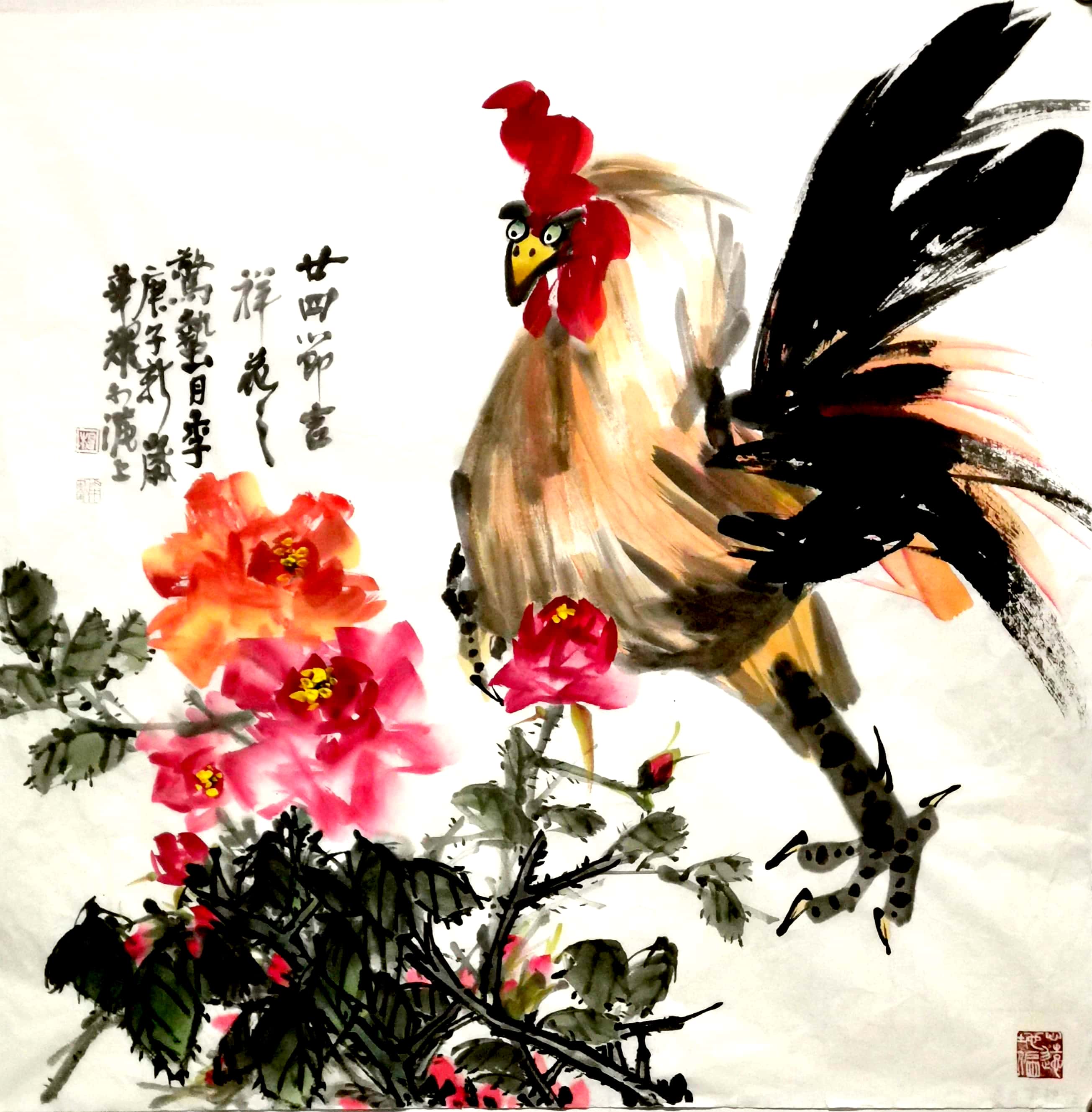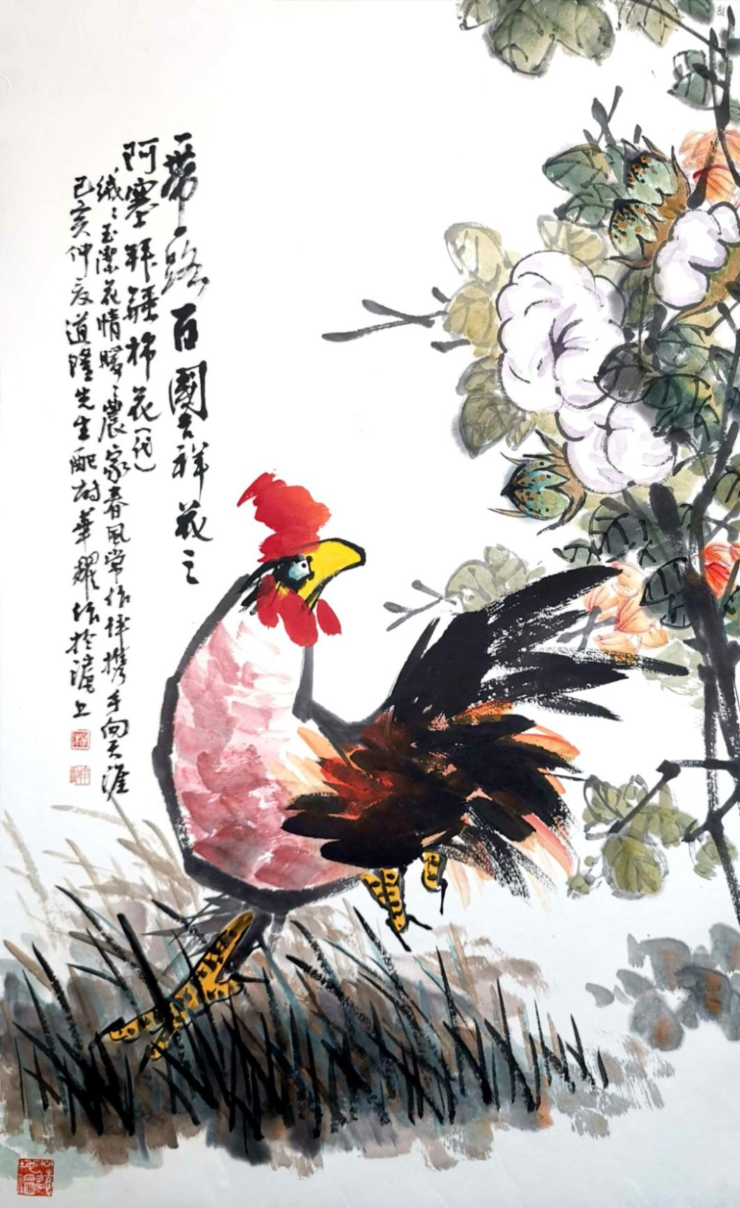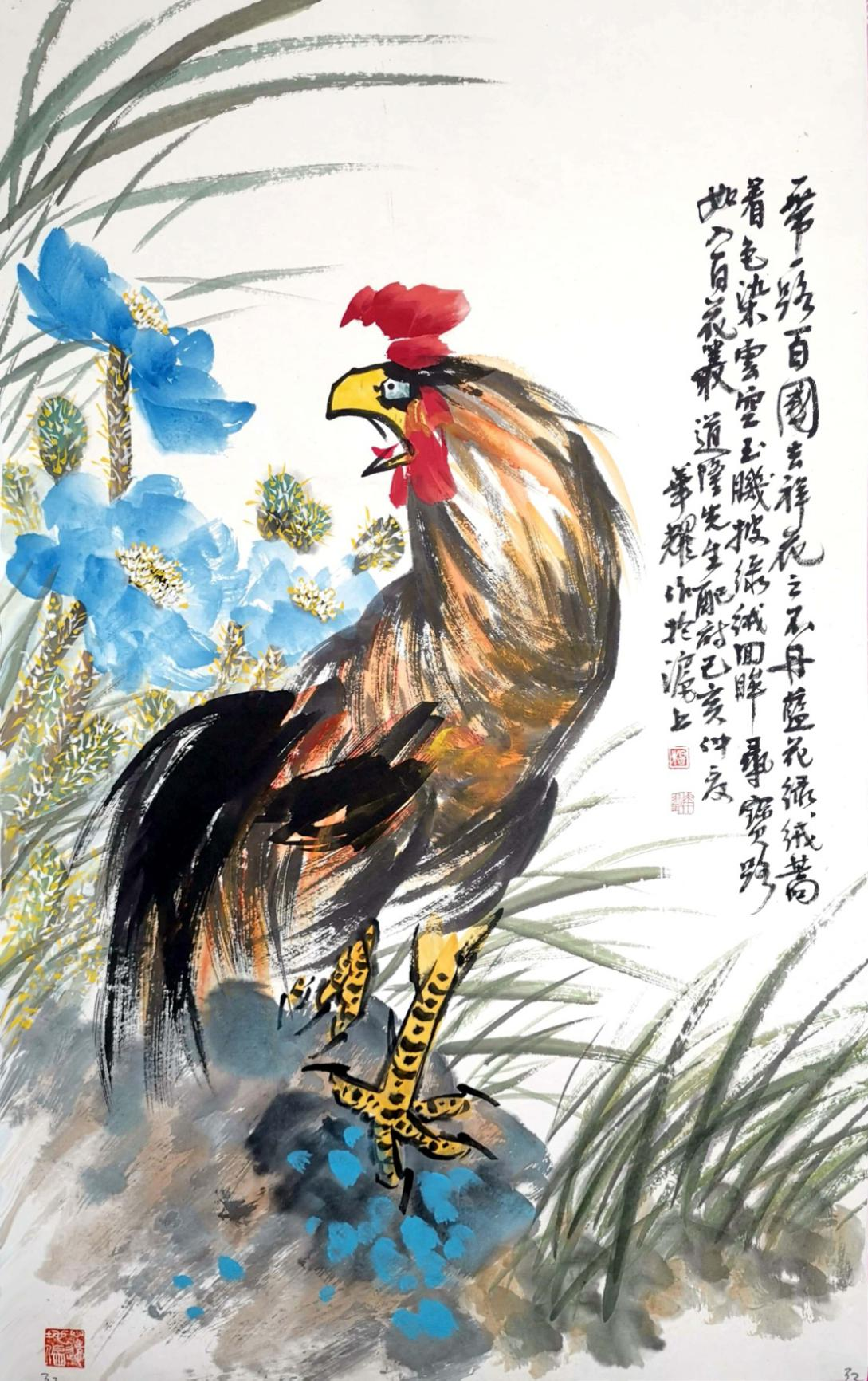 杨华耀的书法融汇造化,贯通古今,楷隶行草信手书来,皆能得其真奥。线条质感律动,明快酣畅,笔力雄健,气度恢弘。其小楷峻拔明丽,灵巧飞动,独具自家风貌。其画风旷达豪放,用笔方圆兼备,刚柔相济。花鸟山水皆能,尤擅画鸡,被书画界誉为“画鸡之王”。