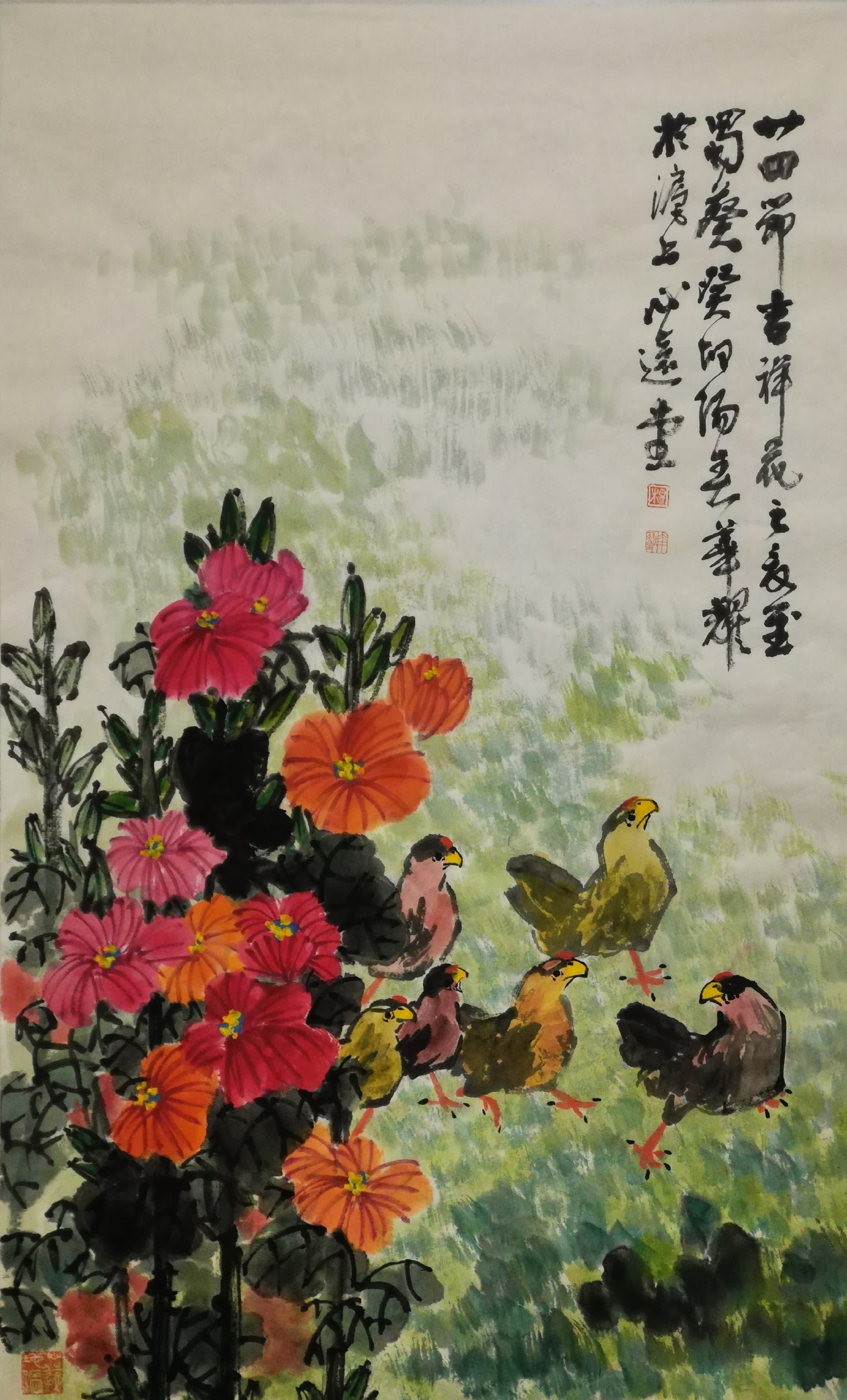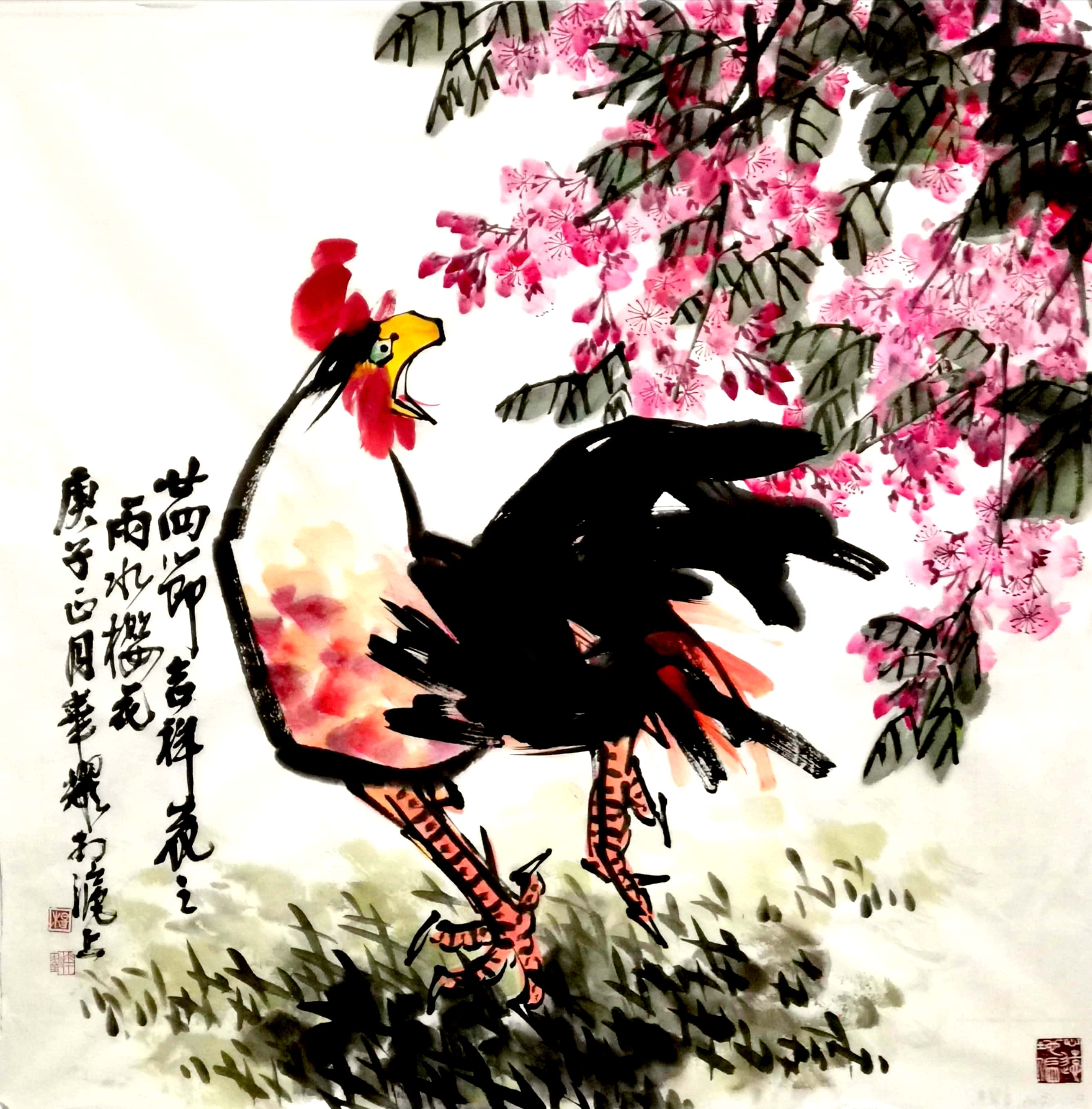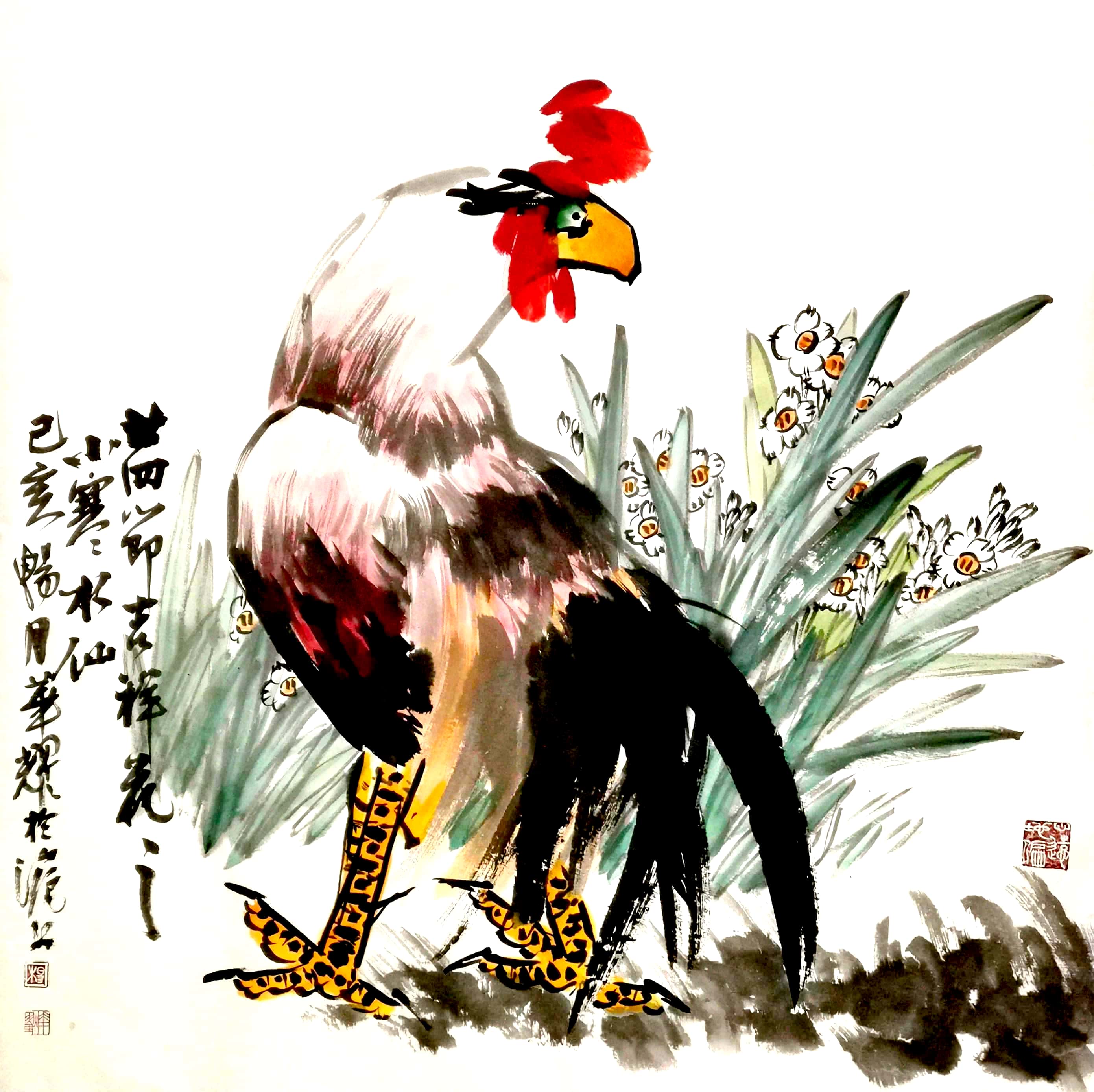 杨华耀的书法融汇造化,贯通古今,楷隶行草信手书来,皆能得其真奥。线条质感律动,明快酣畅,笔力雄健,气度恢弘。其小楷峻拔明丽,灵巧飞动,独具自家风貌。其画风旷达豪放,用笔方圆兼备,刚柔相济。花鸟山水皆能,尤擅画鸡,被书画界誉为“画鸡之王”。