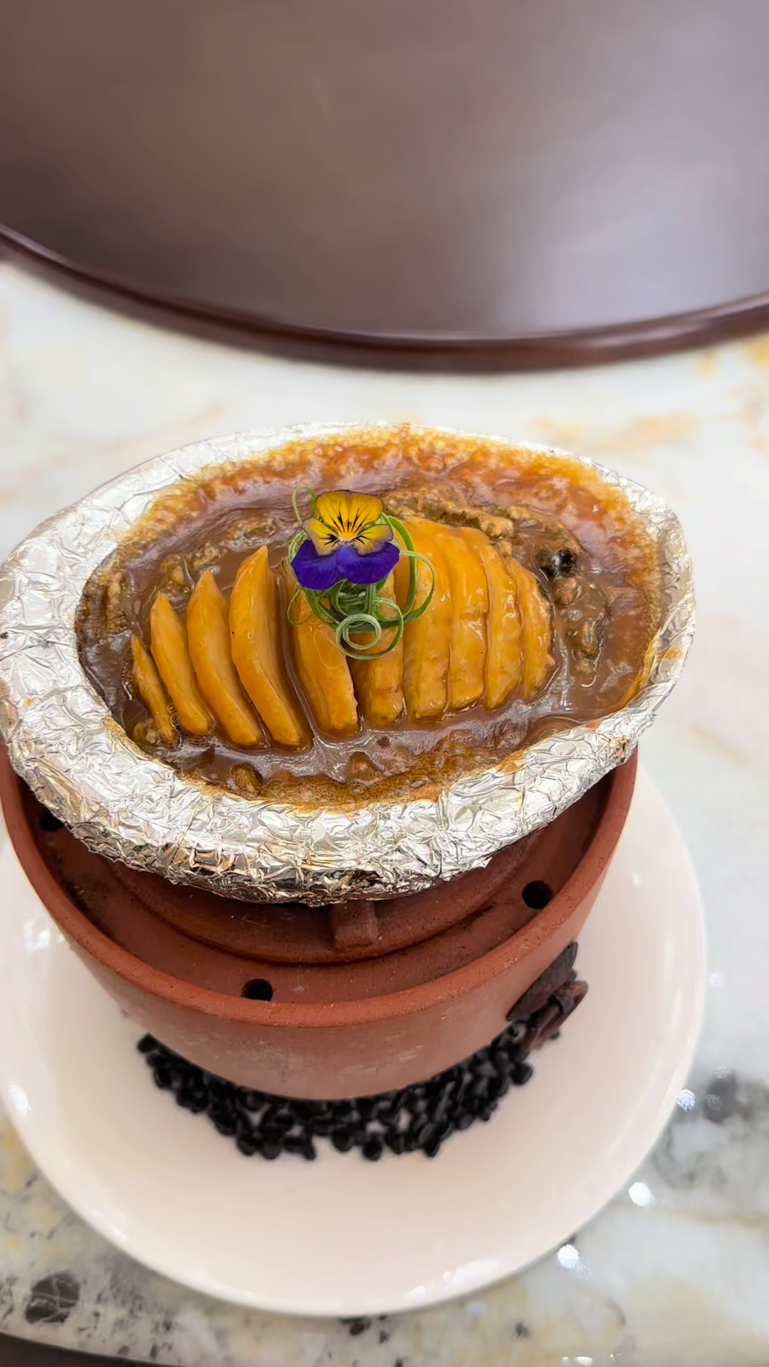 在福田峪园后厨,处理澳洲鲍鱼是项仪式般的精细作业。拥有二十年经验的林师傅演示道:"先用60℃温水浴5分钟让鲍鱼松弛,这个温度既能保留鲜味又不会导致肉质紧缩。"餐厅炭烤做法将鲍鱼美味推向极致。当烤鲍上桌,服务生会建议先品尝原味。用银质餐刀切下薄片,截面可见完美的焦褐层与半透明肉质。入口瞬间,先触到的是类似焦糖布蕾的脆壳,继而深海生物特有的甘鲜如浪潮般涌来,最后留下淡淡的烟熏余韵。第二片蘸取鲍汁,醇厚的酱香与鲍肉竟碰撞出类似黑松露的复合香气,这种奇妙的"鲜味叠加效应"正是衡量顶级海鲜的重要标准。