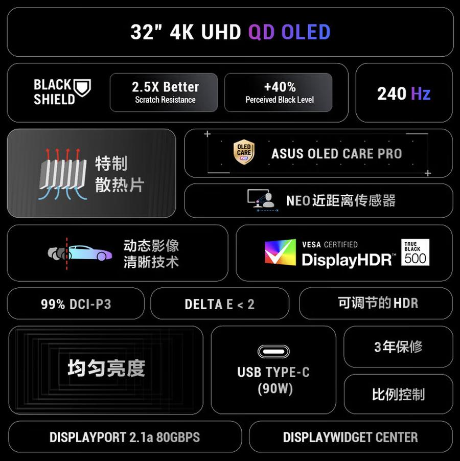 该显示器配备31.5英寸QD-OLED面板,分辨率达3840×2160(4K UHD),不仅支持最高240Hz刷新率,还拥有0.03ms GTG的极速响应时间,可彻底消除游戏画面拖影;面板搭载的华硕BlackShield涂层技术,将抗刮擦能力提升至普通面板的2.5倍,还能在明亮环境下使黑位观感提升40%,配合1500000:1的超高对比度与HDR TRUE BLACK 500认证,可呈现深邃纯净的黑色层次与丰富光影细节,同时其峰值亮度可达1000尼特,支持杜比视界与可调节HDR模式,色彩表现同样专业,拥有99% DCI-P3广色域覆盖、10bit色深,加上ΔE<2的精准色准,无论是电竞对战还是专业创作,都能呈现鲜活细腻的色彩。