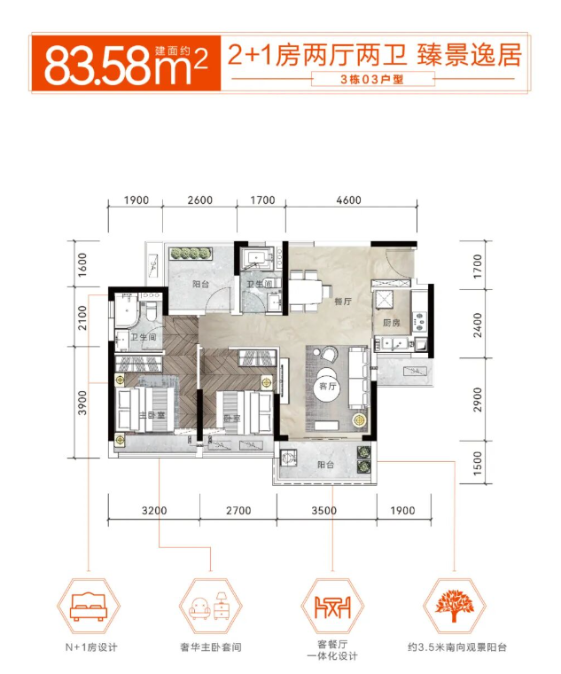 83.58平方米的紧凑两房两厅两卫户型: