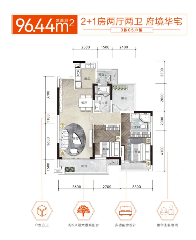 96.44平方米的二房两厅两卫户型: