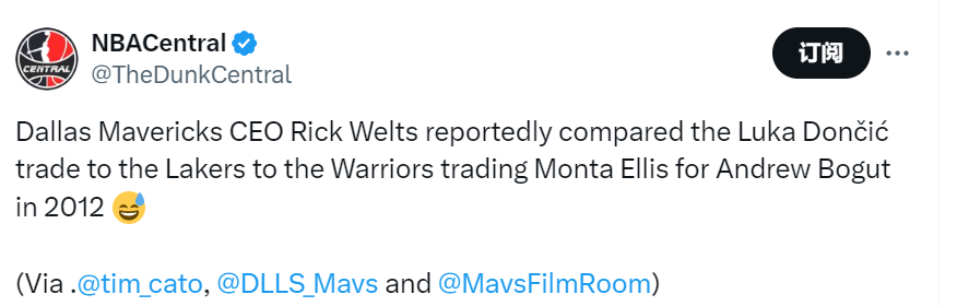 北京时间4月16日,据独行侠队记蒂姆-卡托报道,在一场新闻发布会上,独行侠CEO里克-韦尔茨做了一个令人震惊的对比,以此解释他们交易东契奇的理由,将其类比为2012年金州勇士队用蒙塔-埃利斯换来安德鲁-博古特的那笔交易。独行侠的总经理哈里森也强调,球队不后悔交易东契奇。