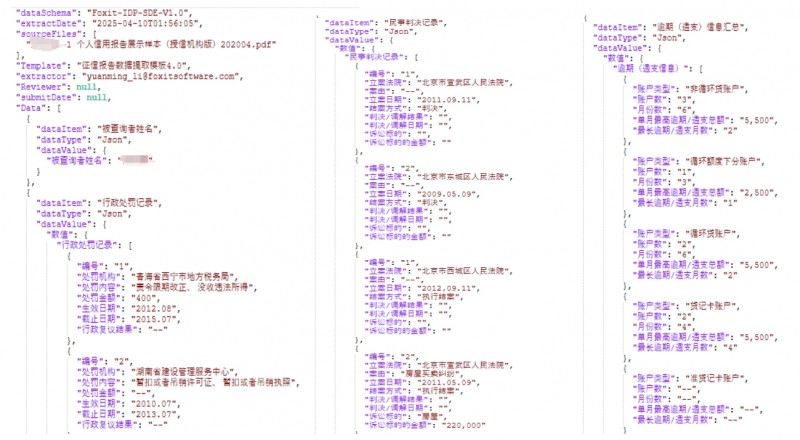 某银行建设新一代个人信贷风控系统,需从PDF版征信报告中提取以下信息:姓名、证件号、就业状态、个人查询次数、欠税记录、强制执行记录、民事判决、行政处罚、近5年逾期月份数等。