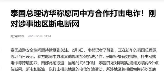前段时间,泰国总理来到我国后,局面开始加速改变。泰国采取断电断网这一招,可以说是对电诈分子是釜底抽薪,让园区无法维持运作,犯罪分子无法与外界联系,转移资金无从谈起,内部秩序逐步瓦解。