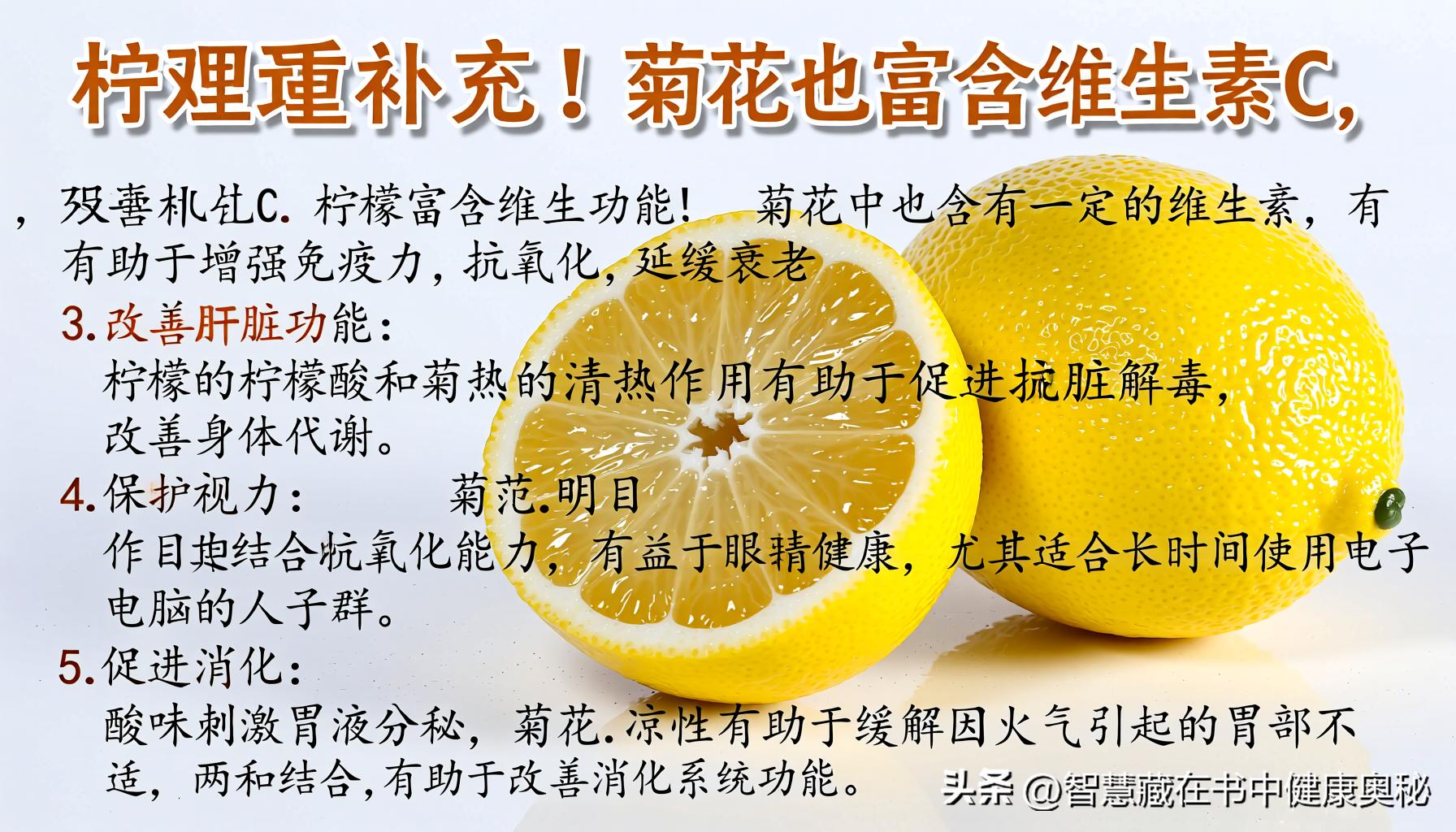 2. 维生素C的双重补充:柠檬富含维生素C,菊花中也含有一定的维生素,有助于增强免疫力,抗氧化,延缓衰老。