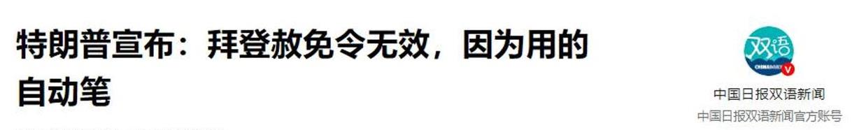特朗普嘲讽拜登:自动签名算不算数特朗普说的那个理由啊,简直就跟我说是我用拳头打了人,所以是拳头有问题而不是我的问题一样,真是离谱到家了。最近特朗普在社交媒体上特别高调地发话,说拜登的赦免令没用,还一直暗示拜登是被别人控制着做事的。特朗普这么一搞,美国国内就炸锅了,大家都开始讨论:如果用机器自动签字代替总统亲笔签名,这签名到底算不算数啊?