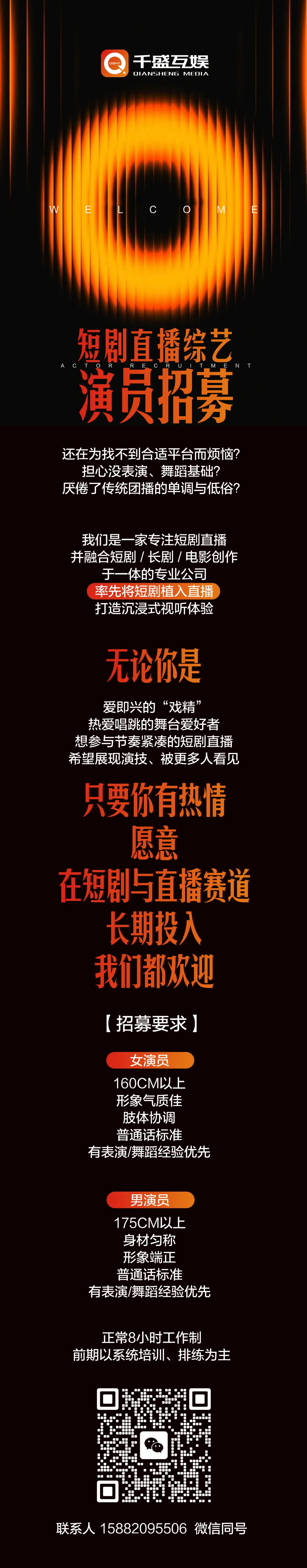 我们将携手,将“短剧直播综艺”从一个概念,打造成让行业瞩目、让观众追更的现象级内容。 你的演技,值得被更大的舞台看见;你的成长,值得被更多人见证。