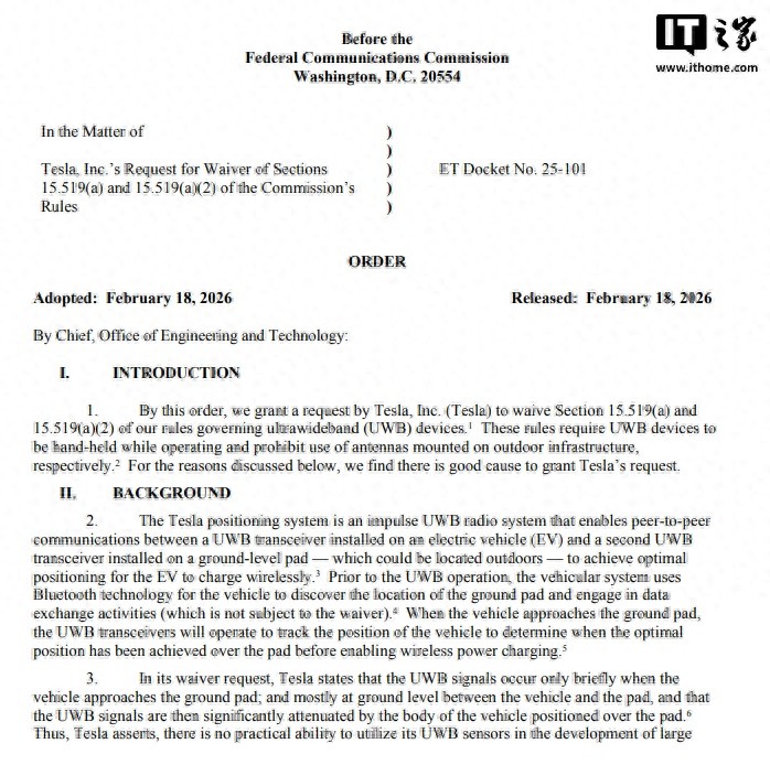 2 月 21 日消息,当地时间 2 月 18 日,美国联邦通信委员会(FCC)宣布批准特斯拉将超宽带(UWB)技术用于电动汽车无线充电系统,为 Cybercab 无线充电扫清了重要监管障碍。