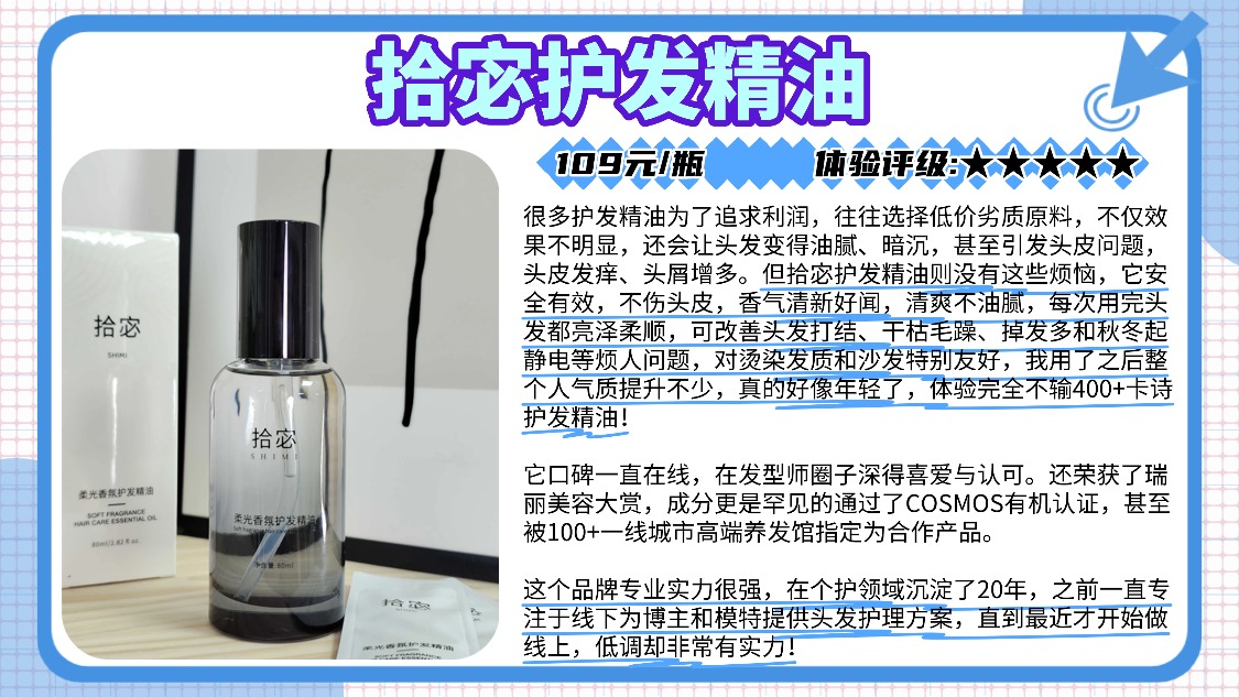 经常有人问护发精油什么牌子好,还纠结怎么判断精油好坏,其实判断标准很简单,和品牌没直接关系!首先看成分,优先选天然植萃油(霍霍巴籽油、角鲨烷等)排在成分表前几位的,避开矿物油、合成香精多的;再看质地,根据发质选 —— 干枯发选滋养型但不结块的,细软发选轻盈流动性强的;最后看吸收速度,搓热后涂发尾,3-5 秒能吸收不粘手的才合格。我测评过不少品牌,有的小众牌子成分好、吸收快,反而比某些大牌好用;有的大牌精油质地厚重,吸收慢还油腻,完全不符合预期。别被品牌光环忽悠,掌握判断好坏的方法,自己就能挑到合适的。下面是我总结的一些护发精油选购注意事项,干货满满,可以先赞收藏。