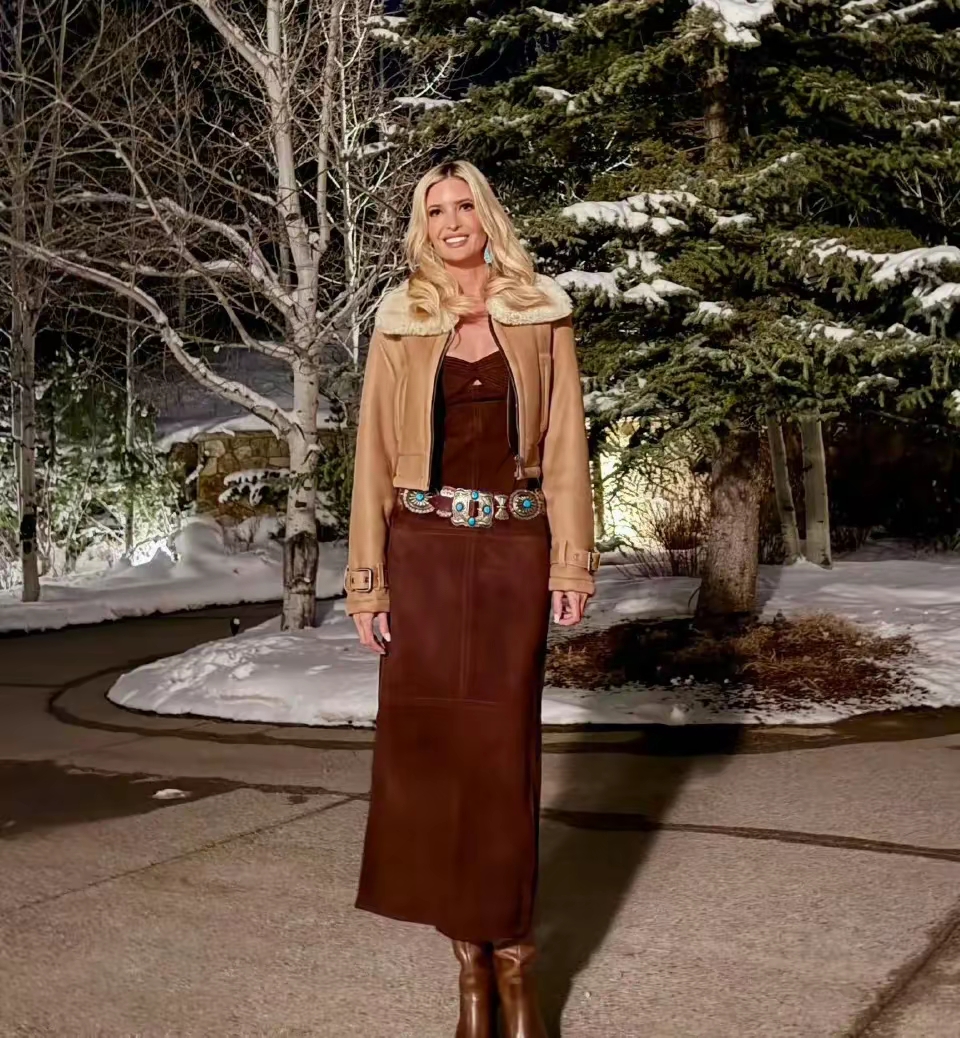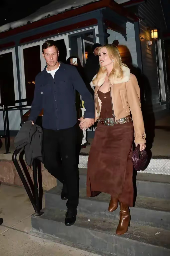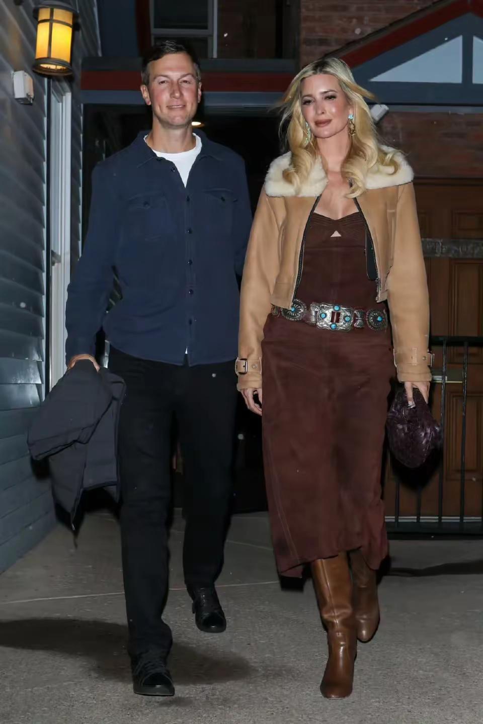 这次,她现身的是贝索斯在小镇Aspen中举办的冬日派对,这是美国有名的滑雪胜地,房屋结构低矮,被大雪覆盖后,更显宁静祥和,也许是为了匹配小镇风格,这次派对的衣着风格偏向朴实的西部牛仔风,伊万卡遵守穿着礼仪,当晚一身棕色系套装亮相,跟她以往的造型比,这次的很特别。
