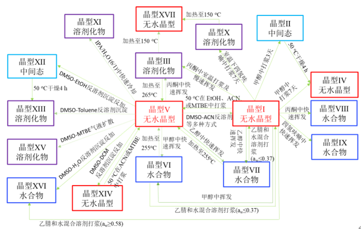 晶型转化关系研究结果显示无水晶型I室温下特定的水活度条件中稳定,且具有良好的物理和化学稳定性、几乎无引湿性、符合开发需求的溶解度,最终推荐为优势晶型。