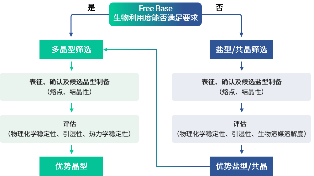 优先推荐热力学稳定且理化性质优异的晶型。若当前形态(如游离碱)生物利用度或成药性不足,建议启动盐型/共晶筛选路径,重复上述评估流程,直至获得满足临床需求的最优固态形式。