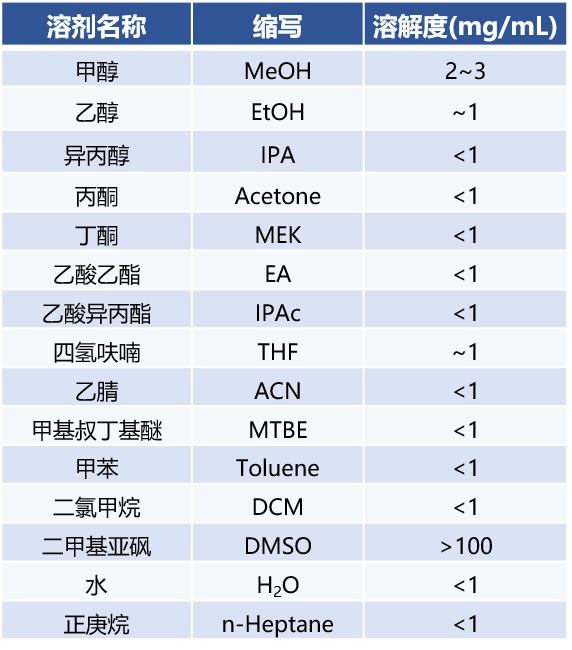 对原料进行XRPD、热分析及纯度检测(要求≥98%以排除杂质干扰);基于ICH指导原则构建涵盖ICH 2类、3类及非共性溶剂的多样化体系,通过快速溶解度测试为结晶实验提供热力学依据。
