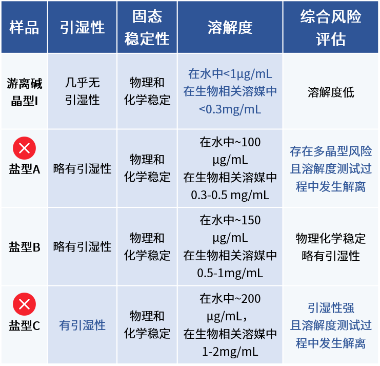 于是我们优先启动盐型/共晶筛选,构建了涵盖引湿性、固态稳定性及溶解度的全方位评估模型,通过对不同晶型的综合风险评级,成功确定了最优盐晶/共晶,不仅避免了客户在无效方向上的资源浪费,更证明了正确筛选路径的选择与专业综合评估能力是项目成功的关键。