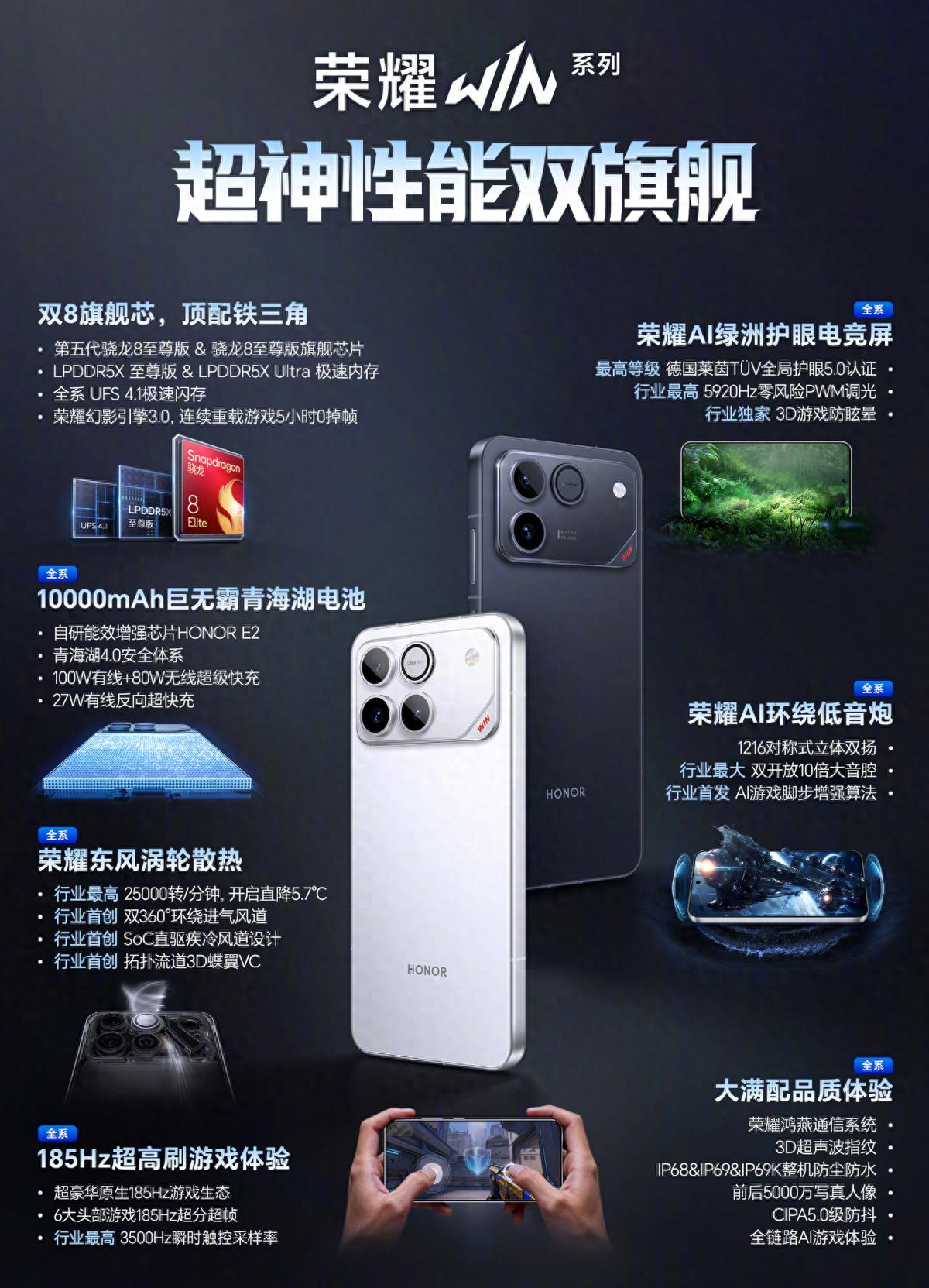 没想到在2025年进入倒计时阶段,手机市场仍然迎来重磅新品。12月26日,荣耀正式发布“年度电竞夯机”荣耀WIN系列,包括了荣耀WIN和荣耀WIN RT两个版本,起售价分别为3999元和2699元。该系列不仅致力于在性能、续航、散热及屏幕体验方面树立全新行业标杆,也在音频和通信等方面带来了全方位升级,为用户带来前所未有的创新电竞体验。同时,荣耀WIN系列将成为“三角洲行动烽火职业联赛指定手机”!