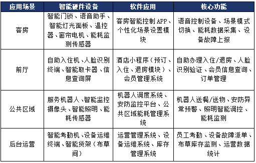 直接面向客户与运营人员的终端设备,覆盖客房、前厅、公共区域等全场景,包括智能硬件设备与软件应用两大类,具体如下表所示: