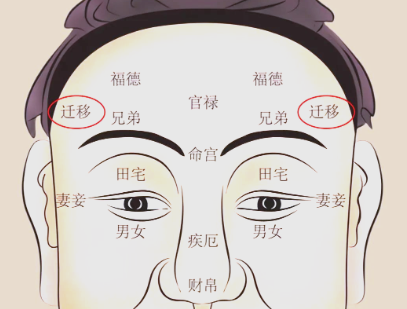 迁移宫位于额头两侧,从眉尾向上延伸至发际线两边,左右对称,也叫“外游宫”“边地宫”。两眉之间的天中至天庭属于命宫,而两侧稍偏外就是迁移宫。古籍《神相全编》云:“迁移宫要宽广明净、骨起圆润、色泽润红,方主外出贵人多、事业开拓顺。”