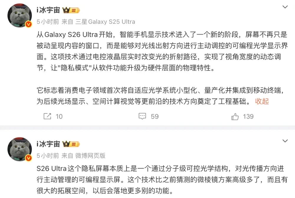 S26 Ultra这个隐私屏幕本质上是一个通过分子级可控光学结构,对光传播方向进行主动管理的可编程显示屏。这个技术比之前猜测的微棱镜方案高级多了,而且有很大的拓展空间,以后会落地更多别的功能。