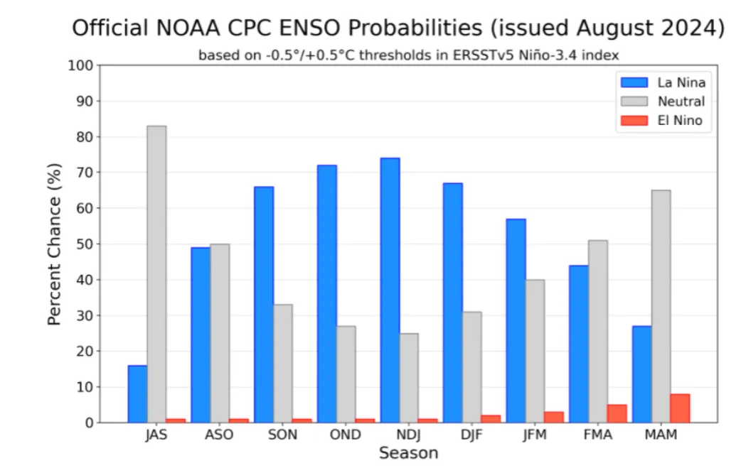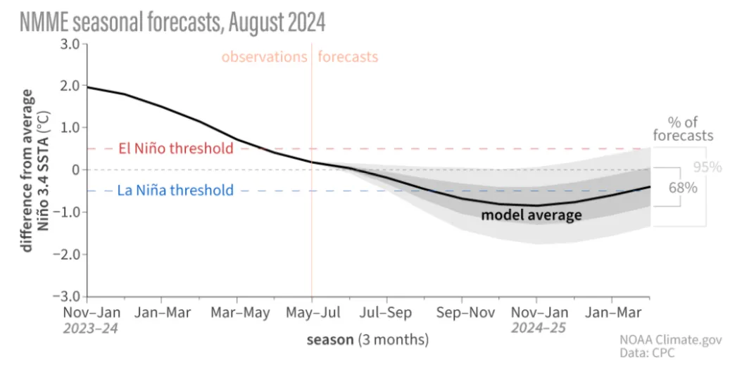 按照NOAA在8月给出的数据显示,根据8月份的厄尔尼诺-南方涛动 (ENSO) 预测,太平洋地区仍保持厄尔尼诺-南方涛动 (ENSO) 中性状况,拉尼娜现象有望在秋季形成,并且这个可能性为 66%。