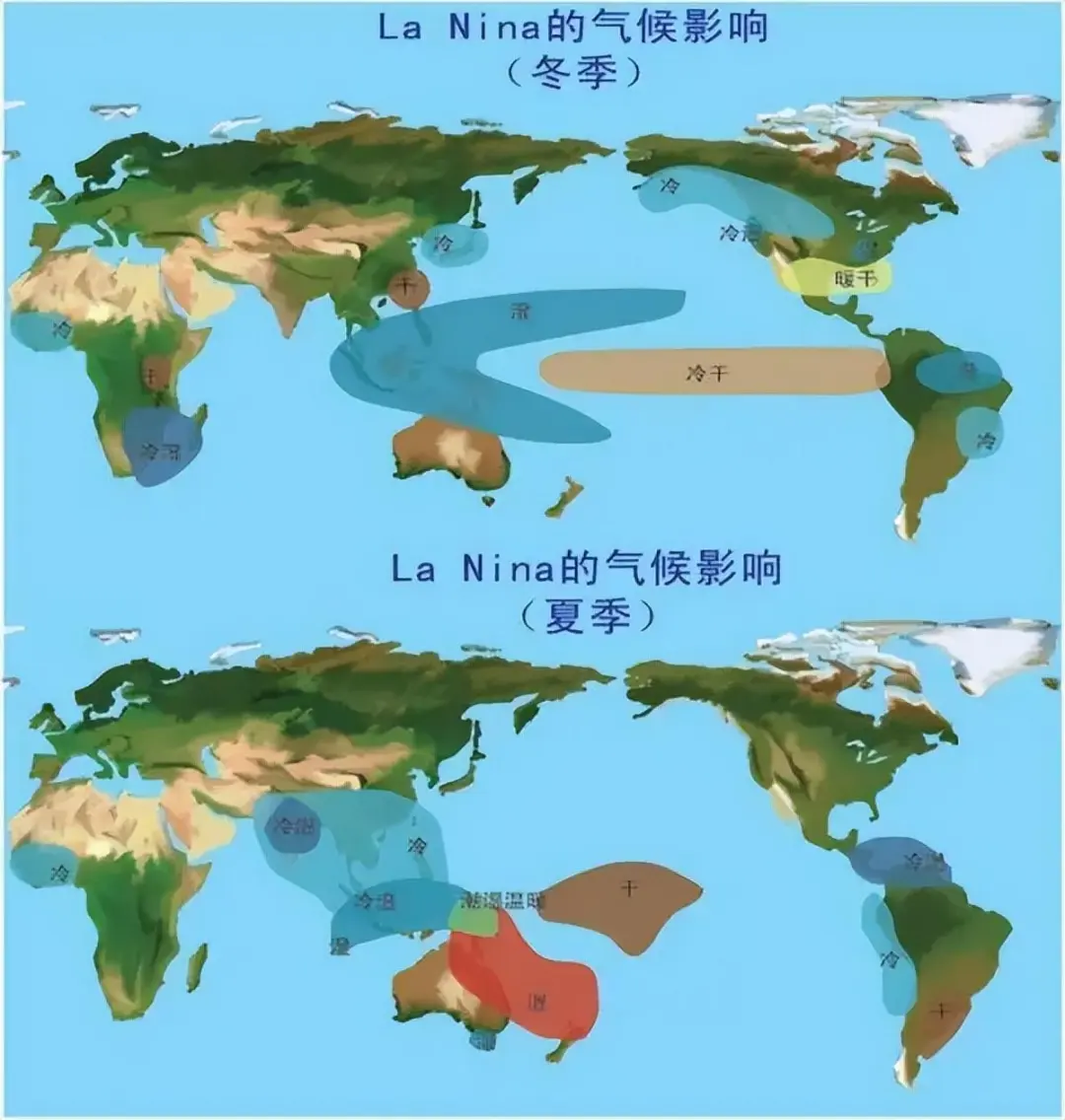在拉尼娜发生时,南美沿岸附近地区(如阿根廷)降水稀少,而印度尼西亚、澳大利亚东部则多雨,当拉尼娜长时间持续时,非洲中部、美国东南部等地常发生干旱,巴西东北部、印度和非洲南部等地容易出现洪涝。