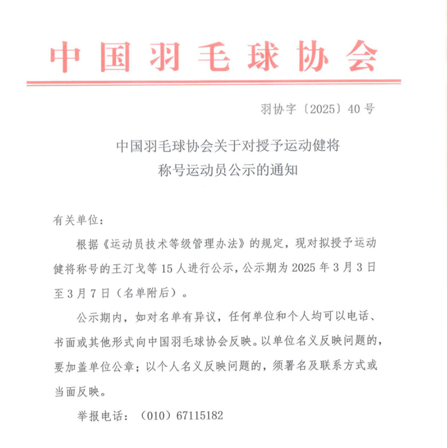 3月3日,中国羽毛球协会发布“关于对授予运动健将称号运动员公示的通知”,包括奥运冠军陈雨菲、陈清晨在内的15名国手榜上有名。