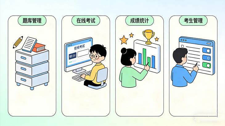线上考试系统:依托互联网技术,实现试题管理、试卷生成、在线答题、自动阅卷、成绩统计、数据分析等全流程线上化的工具,广泛应用于教育、企业、职业认证等领域;