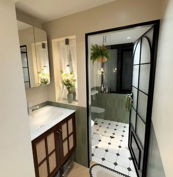 当然啦,装修过后也是将上述问题统统都解决了个遍,洗手台外移做干湿分区,直接少了一半清洁难题;里面浴室也做了半墙浴屏分隔,洗澡时能避免溅水;风格更是从老破小变成了复古风,又好看又实用。