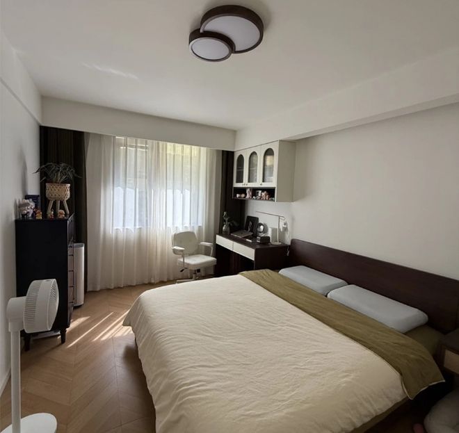 装修后,重新刷了墙、换了窗,并在房间中央放上一张双人大床,白天阳光照进室内,再也没有之前那种昏暗逼仄的感觉。