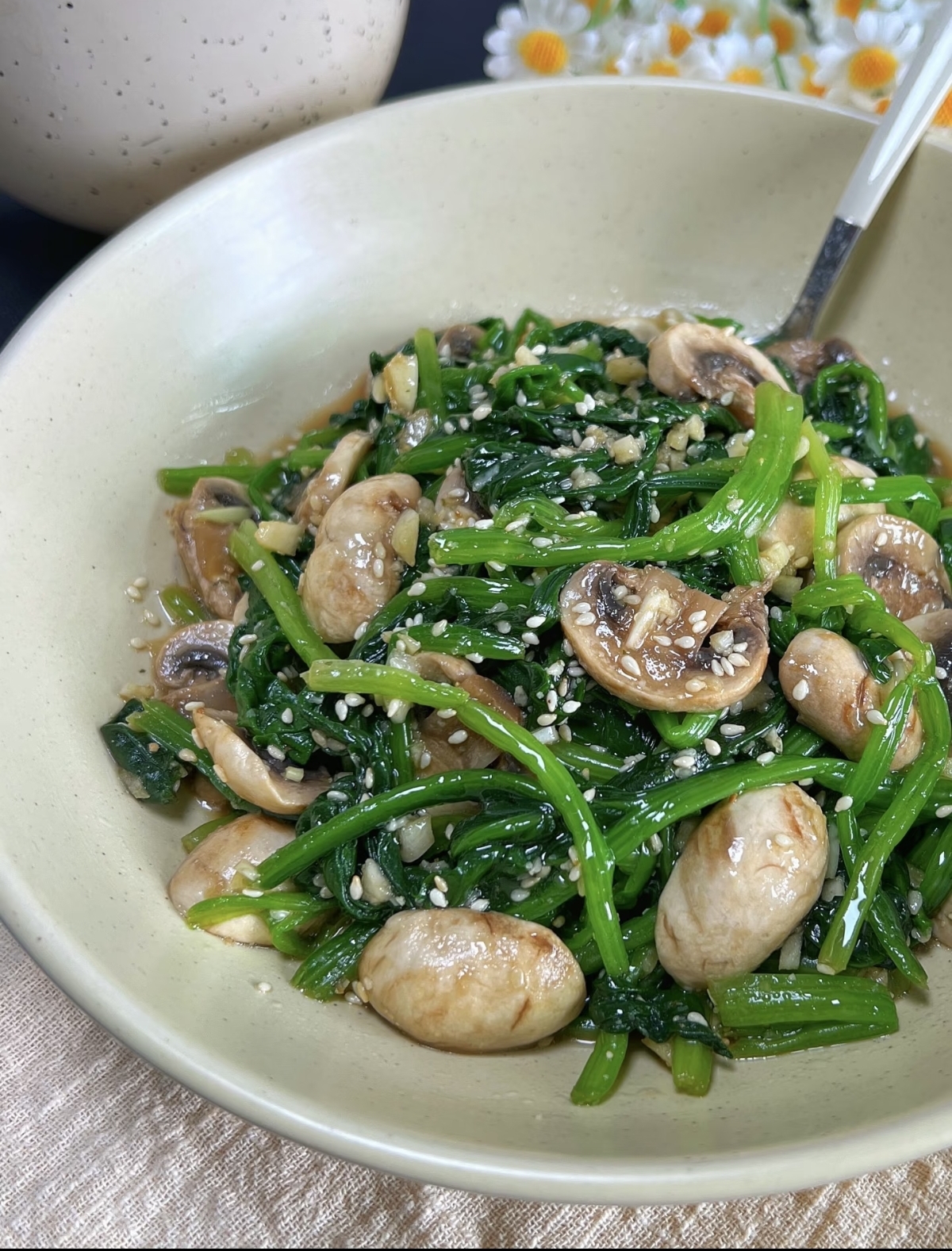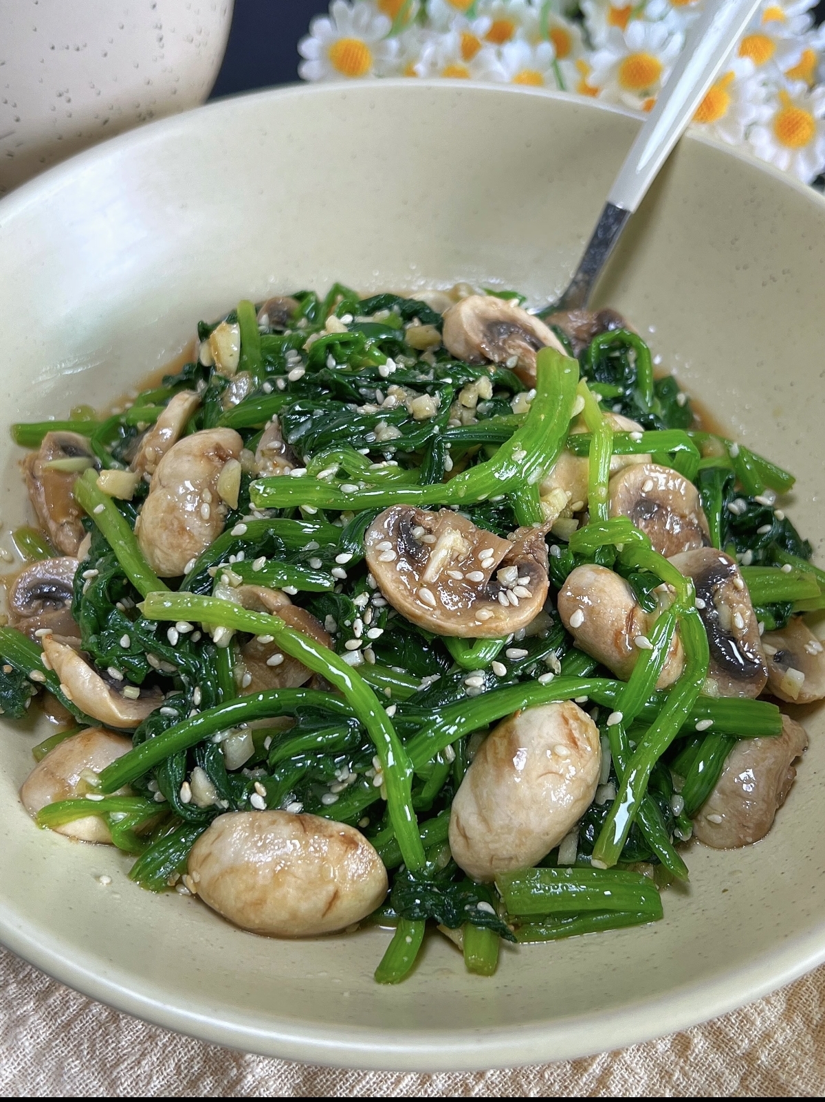 最后一步是调味与融合。将准备好的蒜泥、生抽、香油等调料一股脑倒入碗中,如果喜欢,还可以加一点黑胡椒粉增添风味。用筷子充分拌匀,让每一根菠菜、每一片口蘑都均匀地裹上酱汁。你会发现,简单的食材在酱汁的调和下,瞬间焕发了生机。如果想要一点仪式感,可以将拌好的菜装入一个小碗中,压实,然后倒扣在盘子上,形成一个精致的圆柱体,最后淋上一点剩余的酱汁,便是餐厅级别的摆盘。这盘菠菜拌口蘑,色彩清新,香气扑鼻。夹一筷子送入口中,菠菜的清爽脆嫩与口蘑的鲜香韧劲在舌尖交织,蒜香与酱香层层递进,简单却不寡淡。它告诉我们,美味与健康并非不可兼得,有时候,最朴素的食材,用最恰当的方式烹饪,便是夜晚里最温暖的慰藉。
