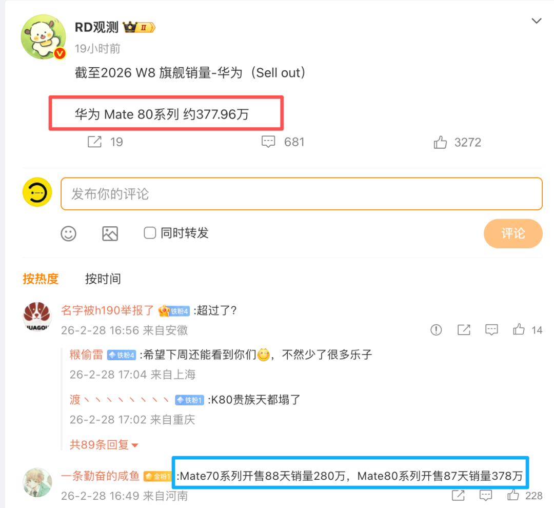 根据数码博主“RD观测”公布的最新数据,截至2026年第8周,华为Mate 80系列累计销量达377.96万台。