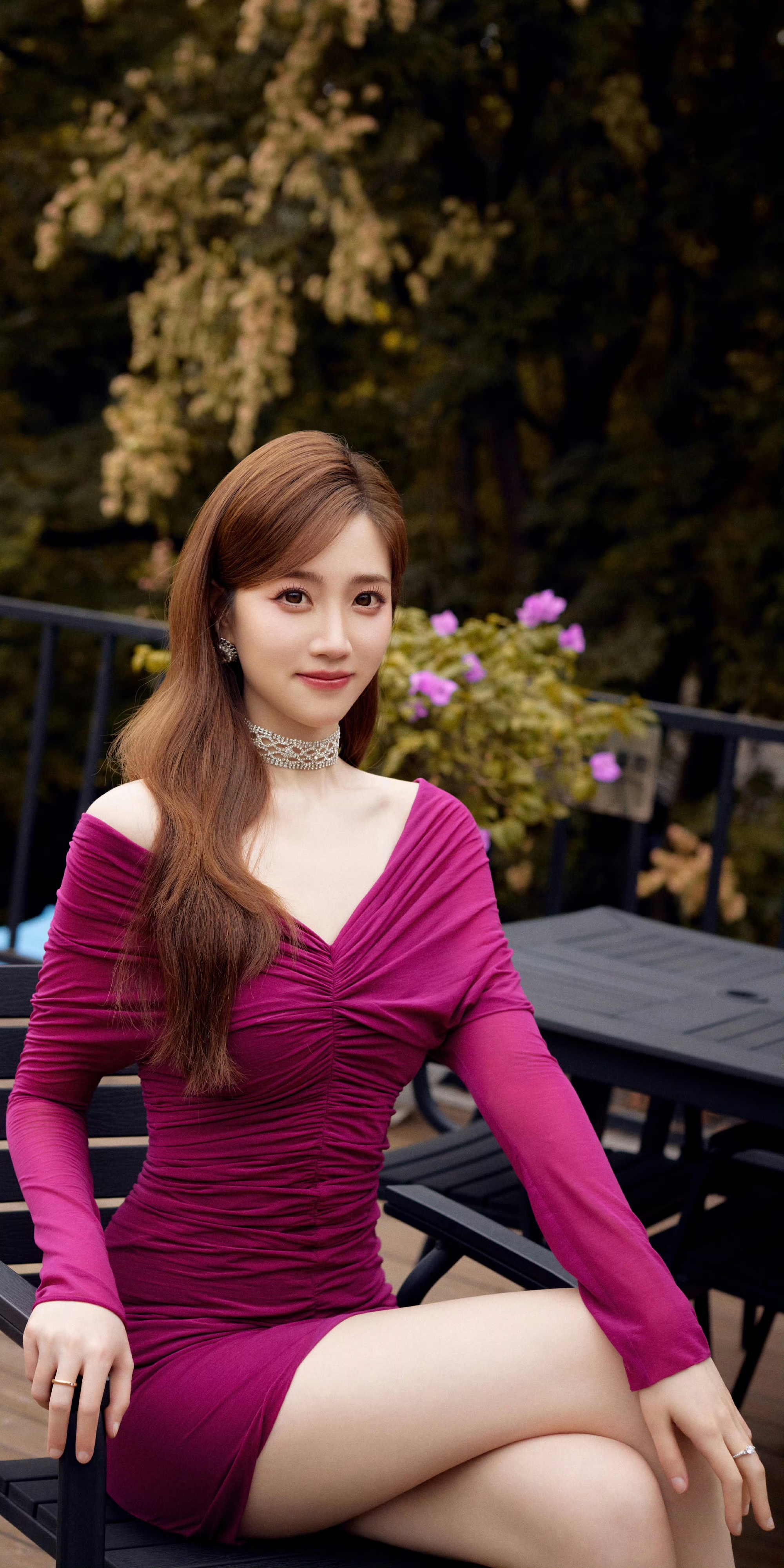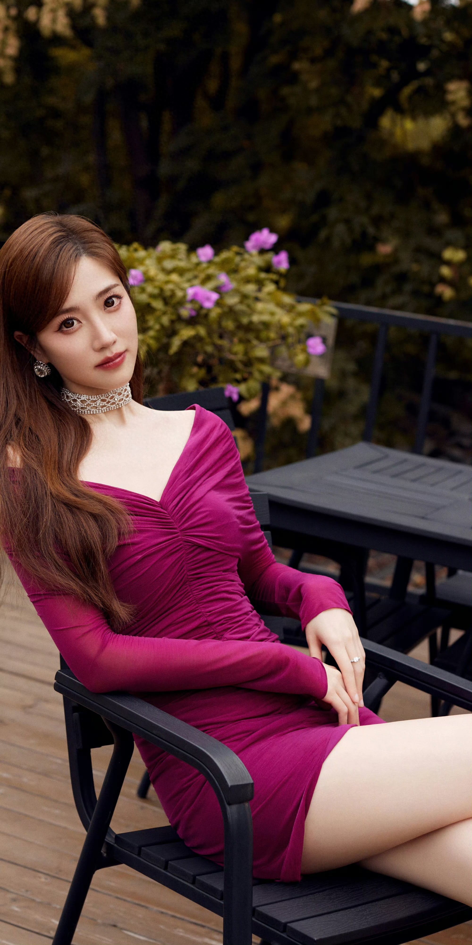 这组外景写真里,张纯烨的美多了几分慵懒与缱绻。她或斜倚在黑色铁艺椅上,指尖轻搭椅边,眼神澄澈又带着一丝迷离;或扶着栏杆亭亭而立,裙摆的不规则剪裁衬得腿部线条愈发修长,珍珠高跟鞋的细带缠绕着脚踝,像给灵动的身姿系上了温柔的注脚。深V设计勾勒出的精致轮廓,没有刻意的张扬,反倒因她淡然的神情多了几分高级感,将“性感而不媚俗”的分寸感把握得恰到好处。短裙的褶皱肌理与玫红色的浓郁碰撞,既凸显了她的窈窕身段,又让这份美带着恰到好处的张力,不似浓妆艳抹的刻意,而是从骨子里透出来的婀娜。
