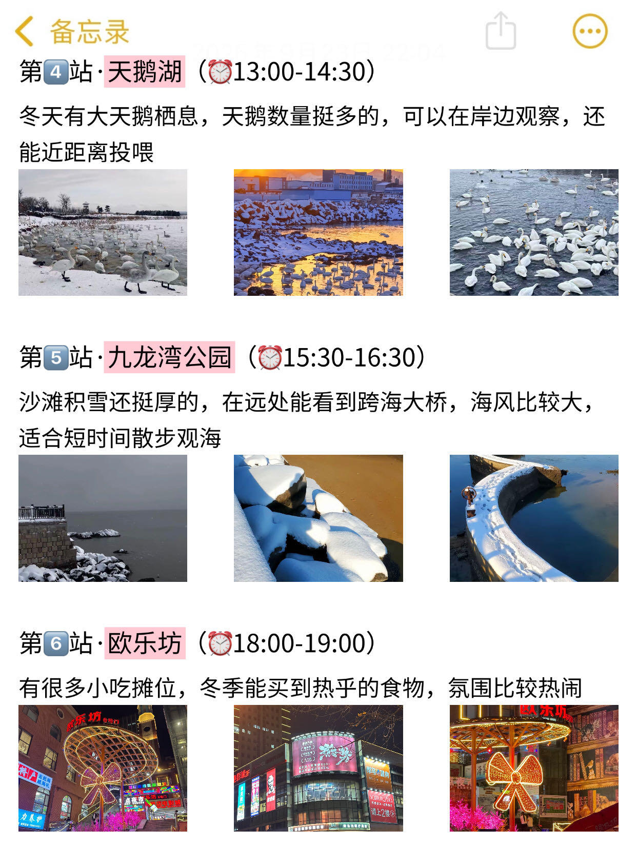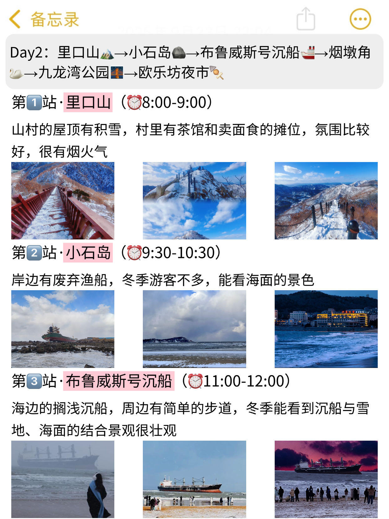 这天建议整个小电车🛵,淡季贼方便!里口山8:00去🕗逛逛很有烟火气,小石岛岸边有废弃渔船🚤,冬天没啥游客,布鲁维斯沉船景观真的壮,周边步道走走就很值;天鹅湖大天鹅巨多🦢,能在岸边投喂;九龙湾公园能看跨海大桥🌉,就是海风太猛,散散步就撤了;欧乐坊夜市18:00超热闹🔥,全是热乎小吃,捧着吃暖乎乎的~