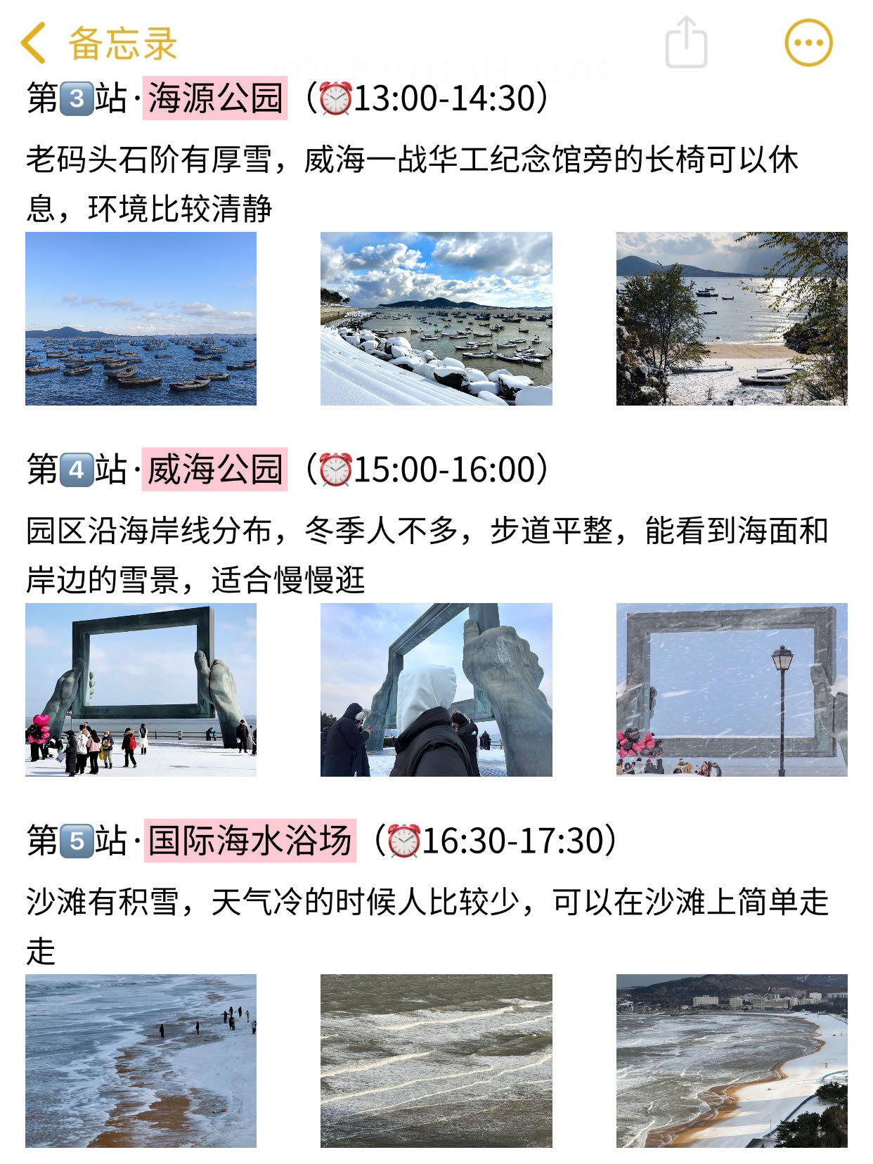 威海港公园9:00到正好🕘,冬天冰面边全是海鸥🐦,木栈道没几个人后面去了悦海公园拍照贼有那味儿📸;海源公园纪念馆旁的长椅能晒太阳🌞,我们在这儿待了好一会儿;威海公园的大相框终于不用排队拍了,框里雪景配海面太出片✨;国际海水浴场人也很少,可以随便出片