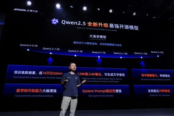 大会现场,周靖人重磅宣布,通义旗舰模型Qwen-Max全方位升级,性能接近GPT-4o;同时发布最强开源模型Qwen2.5系列,成为仅次于美国Llama的世界级模型群,此次共开源100款模型,创造大模型开源史上之最,让企业和开发者以低成本的方式用上大模型。