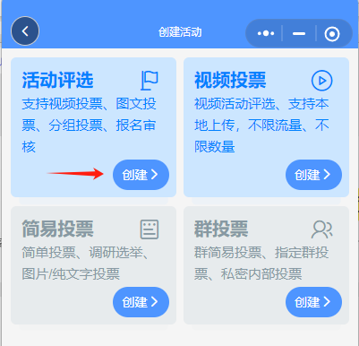 点击首页“创建投票”,选择适合的模板,元旦主题投票活动就选用“活动评选”类型,适配所有场景活动,无论是图文投票还是视频投票、还可以设置投票分组、自主报名等功能设置;