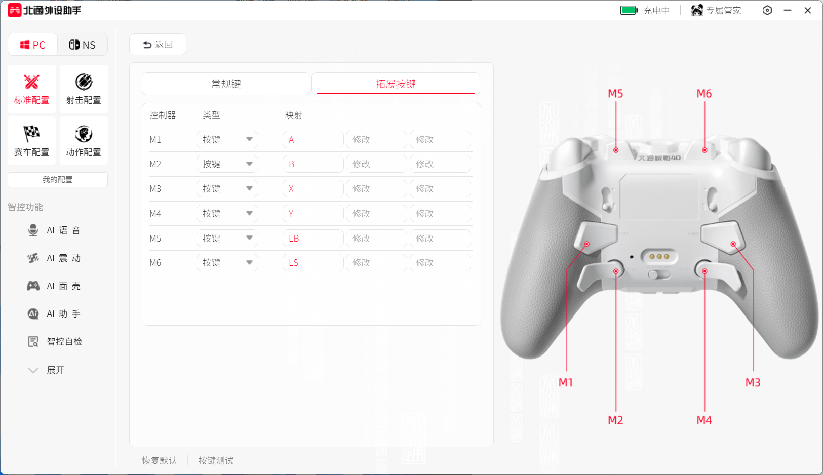 鲲鹏 40 的软件生态同样强大,通过“北通游戏厅” APP可实现50 +项参数自由调节,包括按键映射、摇杆死区、震动强度与灯光效果等。LB、RB按键及背部两颗智控按键支持32组宏定义编程,《王者荣耀》存枪连招、《APEX》压枪脚本可一键触发,还能上传至云端同步至其他设备。