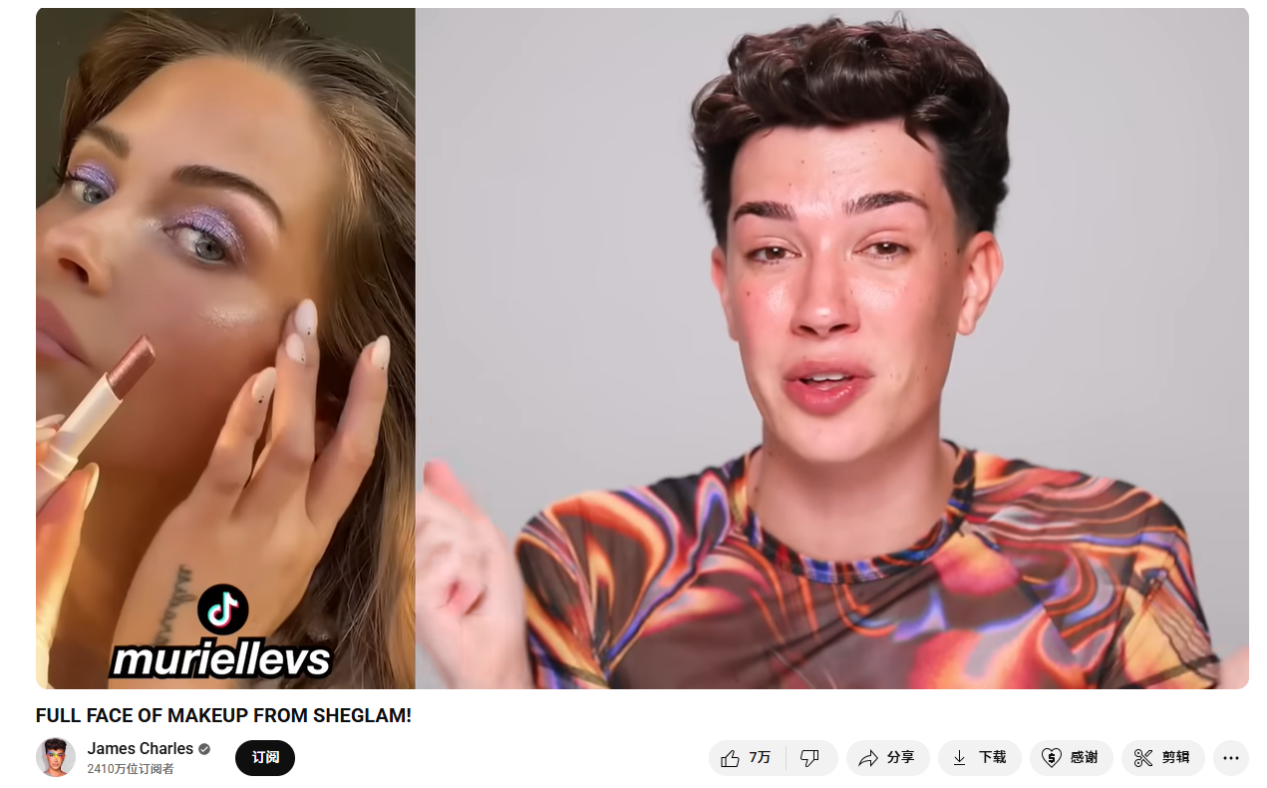 最具代表性的案例莫过于顶流美妆博主James Charles发布的24分钟“FULL FACE OF MAKEUP FROM SHEGLAM”视频。