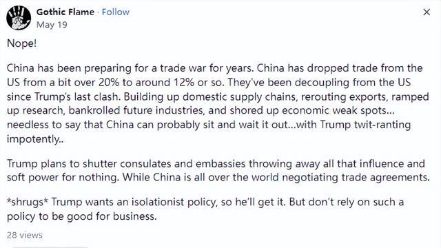 中国多年来一直在为贸易战做准备,中国已将与美国的贸易额从略高于20%降至约12%左右,自特朗普上次冲突以来,他们一直都在为与美国脱钩而做准备,这叫防患于未然。