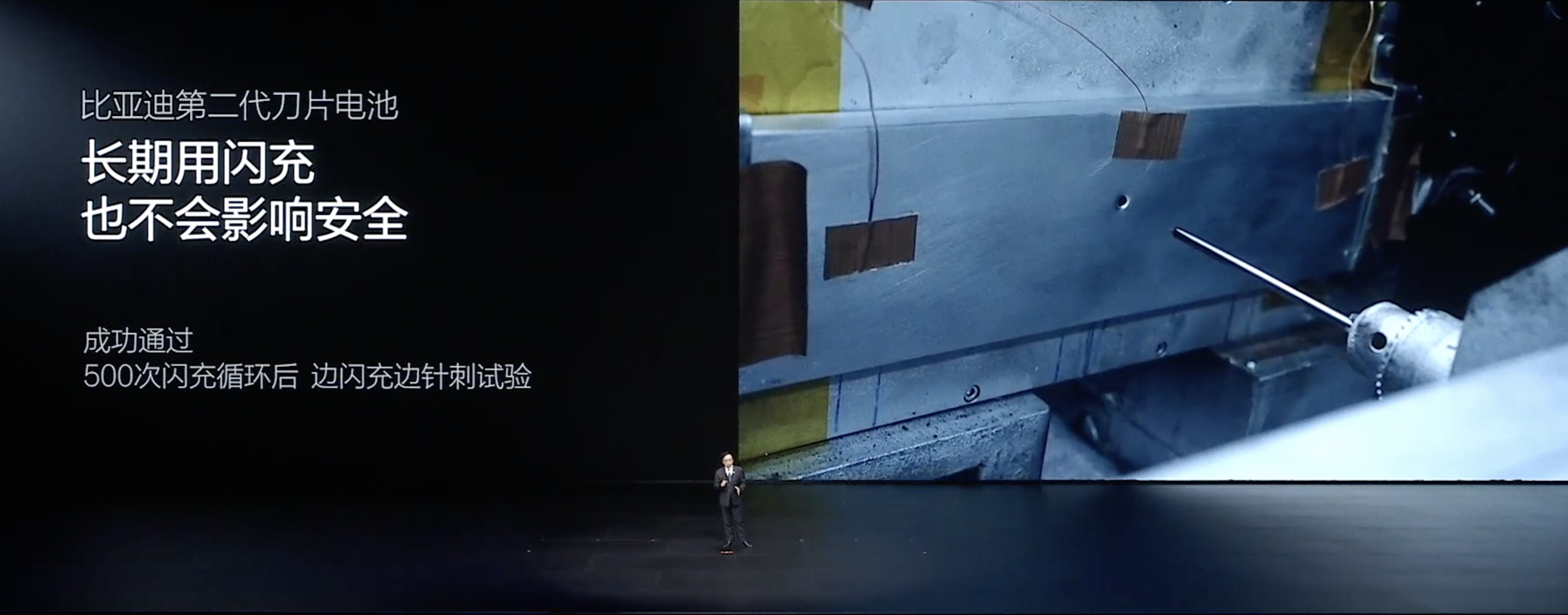 第二代刀片电池内部有“锂离子高速路”,离子跑得快,再加上“全温域智能空调”,边充边散热,充电又快又凉快。哪怕闪充循环了500次,再拿钢针扎透,照样稳得住不起火。在极端条件下,同时让4颗电芯热失控,周围愣是没动。超新国标10倍的能量的底部撞击,电池包依然稳稳扛住。