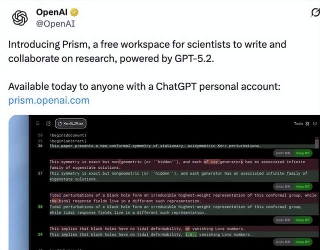 这款名为Prism的科研神器,基于最新GPT-5.2模型构建,依托OpenAI收购的Crixet云端LaTeX平台,将分散的科研环节整合为统一工作流。其核心优势在于全流程AI赋能:可实现文本编辑、LaTeX编译、参考文献管理的云端协同,能将手绘科研草图一键转化为标准化LaTeX图示,还能通过内置Thinking模型辅助假设验证与逻辑推演,大幅减少重复性劳动。