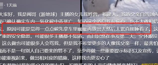 她猜测父亲当时原本只想拿一点点碳放进车中取暖,等过一会儿暖和了再放出去。没曾想因直播时间过长而导致的疲倦使他直接睡着了,车中燃烧的碳很快就产出一氧化碳充满了整个车厢,使得父亲在睡着的情况下中毒身亡 。