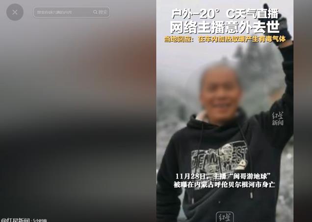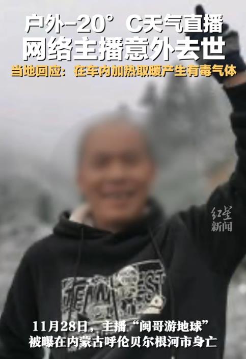 11月28日,经官方报道,内蒙古呼伦贝尔根河市一位名叫“闽哥游地球”的网络主播在户外直播期间,因一氧化碳中毒而在车中身亡。