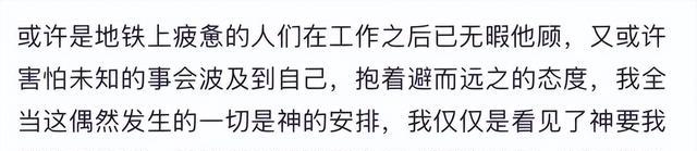 而且她面对乘客理解为当时处于下班时刻,很多人都已经很累,或者怕事情牵扯到自己,选择不管的态度。