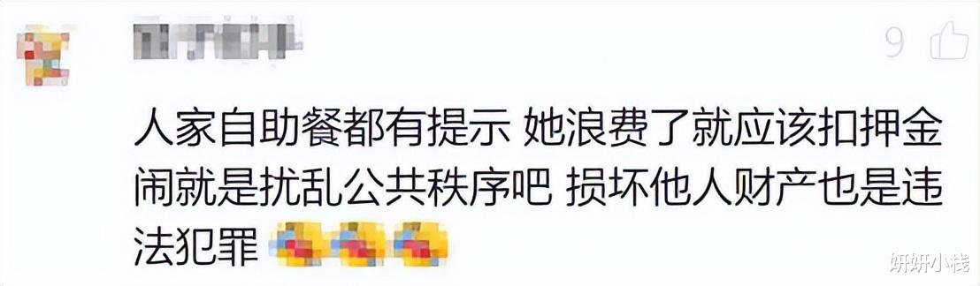 有网友表示,人家自助餐那儿都写着提示呢,她要是浪费了,扣押金就是应该的。要是闹起来,那不就是扰乱公共秩序嘛,还有啊,损坏别人东西也是犯法的。