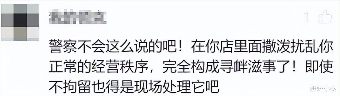 这位网友称,警察应该不会这么说吧!有人在你店里撒泼,搅和得你没办法正常做生意,这完全就是寻衅滋事啊!就算不拘留,也得现场处理处理他吧!
