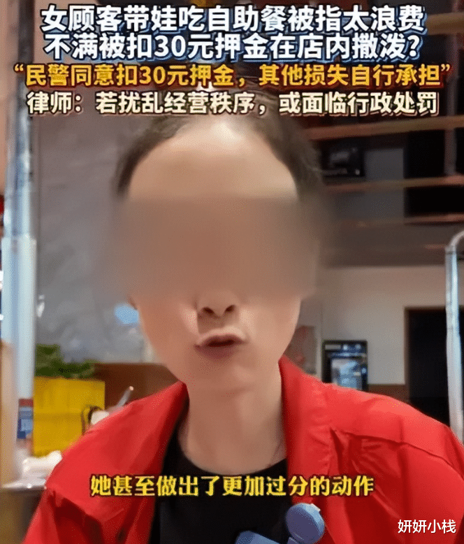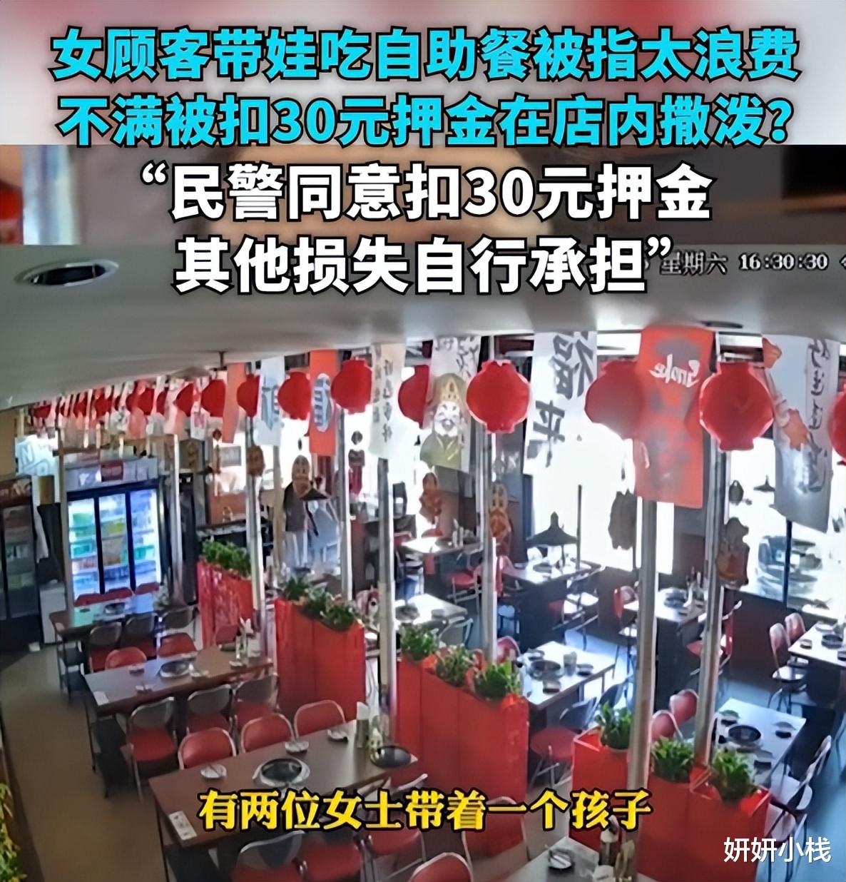 女子带孩子去吃自助餐,结账时因不满店家以浪费为由欲扣除其30元的押金,在店内撒泼。