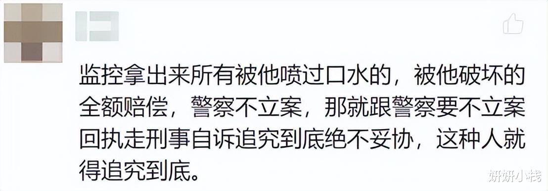另一位网友觉得,把监控调出来,所有被他喷过口水的、被他弄坏的东西,都得让他全额赔偿。